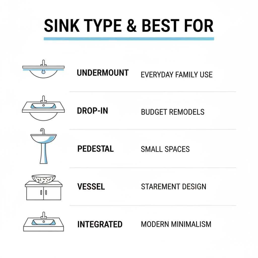 Start with the size of your room and your storage needs. Small powder rooms work best with pedestal or wall-mounted sinks; primary baths benefit from double vanities or wide undermount sinks.