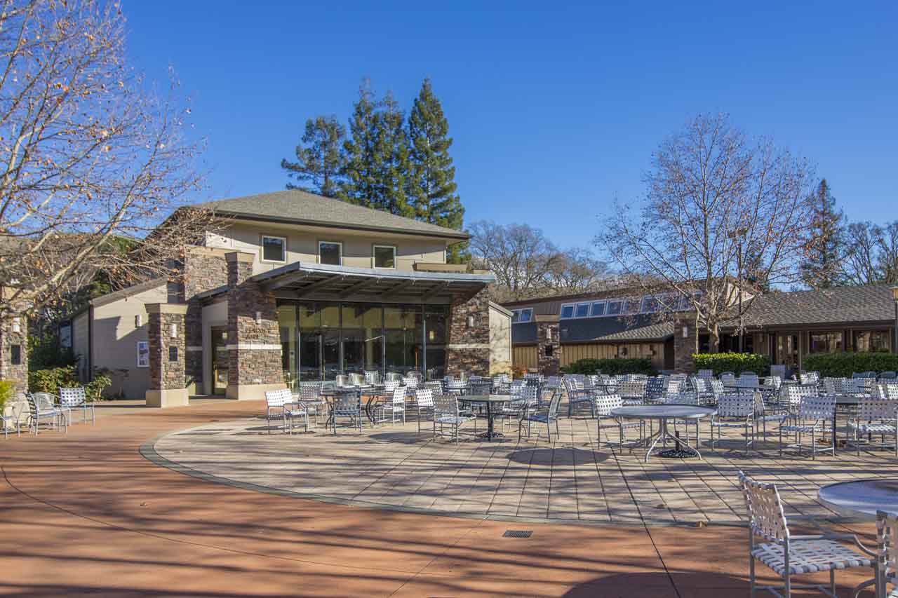 The Rossmoor community center serves as a central hub for social life, featuring a spacious outdoor plaza with seating areas for residents. Spaces like this highlight the community’s long-standing focus on connection, recreation, and active living—key elements in Rossmoor’s history and development as a premier retirement destination.